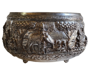 Burmese - Thai - Lao Silverplate Offering Bowl with scenes from the Vessantara Jataka Repoussed and Chased