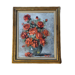 Ruth Womack Texas Midcentury Art Oil on Canvas Palette Knife Red Roses Gilt Swedish Frame
