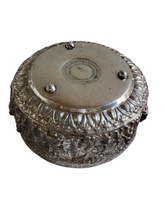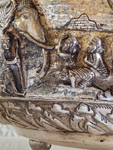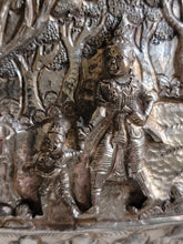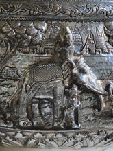 Very large silver-plate bowl, decorated with repoussed, chased and engraved scenes illustrating a Buddhist Jataka story, probably the ‘Life of Gaudama’, with Prince Vessantara & his wife & children, including an encounter with a tiger and lion, courtly scenes, horse chariot, and his prized white elephant, separated by intricate, bold tree frames, a foliate band above, and a wide petal band beneath.