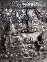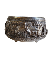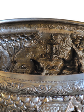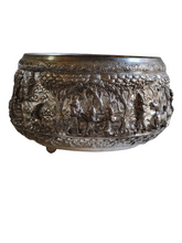The surface of the bowl is finely detailed with embossed, chased and repoussé decoration depicting the Vessantara Jataka (a story of one of Buddha's past lives) figures in extremely high relief, wearing courtly and traditional dress.