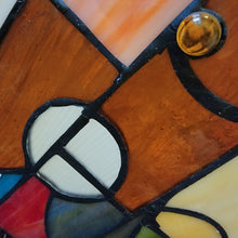 A fusion of Arts and Crafts and Mid-Century Modern styles resulting in an oval shaped stained glass pendant light.
