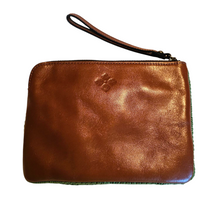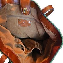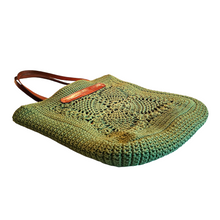 Crochet body with four-leaf pattern; magnetic snap closure; leather tassels, trim, and double shoulder straps; rear slip pocket; burned edge finish