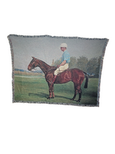 This is a new, 21st Century woven tapestry/blanket reproduction of the original oil on canvas painting by Franklin Brooke Voss titled "Dev Milburn on Jacobs" ca early 1900's.