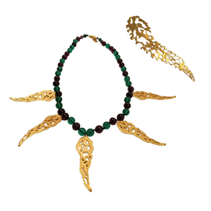 Mary McFadden Gold Tone Stylized Wisteria Filigree Style Brooch & Bead Necklace Set