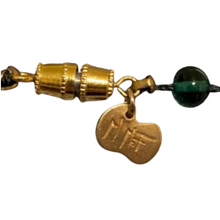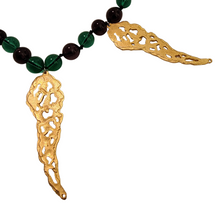 Vintage Mary McFadden Amethyst Emerald Color Beads Hand Knotted Beaded Gold Leaf Necklace measuring 18". The gold drops are 2".