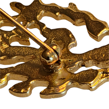 The signed gold tone brooch with a filigree stylized wisteria bloom measures 4 inches long by 1 inch at its widest point.