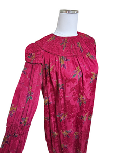 Laura Biagiotti for Bonwit Teller Made in Italy Vintage 1970s Smocked Raspberry Floral Jacquard Silk Dress 44