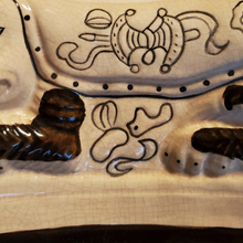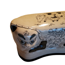 This vintage Song Dynasty "style" Cizhou-ware Chinese ceramic pillow in cat form with brush painted animals and craquelure glaze is in very good vintage condition with a glaze chip on the nose and on the bottom. It is handcrafted and painted, molded in cat form with decorative fierce facial features and Chinese characters. The back is decorated with a beast of burden and surrounding the piece are differing armaments of battle. On the reverse is a crouching Tiger. The hole in the cat's ear was used to fill the piece with warm water during cold winter months for comfort. During the hot summer months, the user filled the piece with cool water for ease of sleeping. Artist's signature present between the eyebrows.