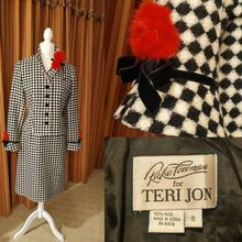 This fabulous 100% wool skirt suit with black and white diamond design is adorned with red rabbit fur pom poms and two black velvet bows at the collar and one at each wrist. Each button is covered in black velvet and there is a small, feminine velvet bow placed at the back middle of the skirt 7 inches above the hem line. The wrists are lined with black velvet trim. Both the jacket and skirt are lined with a silky material. Back zip closure. Pre-owned in impeccable condition.