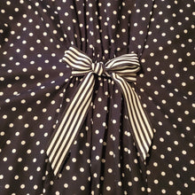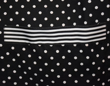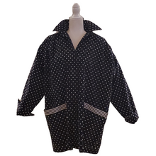 This rare long sleeve cotton jacket with all-over black and white polka dots features two pockets lined horizontally with contrasted wite and black striped ribbon. It has a front button closure and buttons at each cuff. The back of the jacket is adorned with a sewn-in black and white ribbon with stripes. There is also elastic sewn-in on the back behind where the bow is sewn in giving the wearer extra stretch for comfort. Wear it with a pair of white slacks and off you go to your luncheon or to the polo match. Jacket can be worn closed or open and would look great worn with a white top or contrasting color.