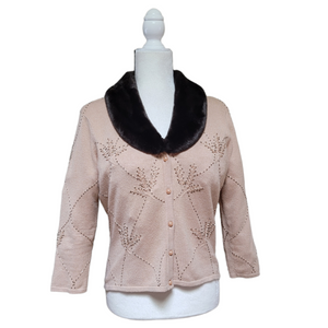 Cache Hand Beaded Silk Cashmere Spandex Sweater Faux Fur Detachable Collar