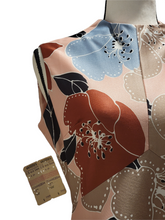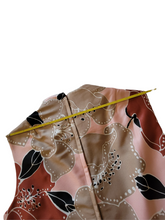 Ground color of the dress is a muted salmon, with tan, bronze, and light blue flowers.