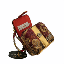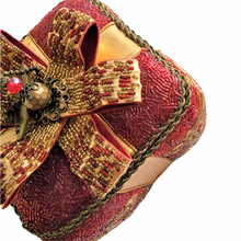 This beautiful ornately embellished handbag, shaped liked a holiday gift box, was handmade by skilled artisans. The bag is covered with scrolls of red, gold, and silver beads and features a neatly tied beaded gift box bow at the top with the interior having a red silky lining. The gold ribbon design and the bottom have a shimmering gold faux leather. The beaded handle features faceted red and clear beads and gold beads.