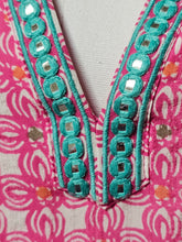 Embroidered mirror embellishments on neckband, cuffs, hem and back yoke.