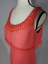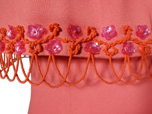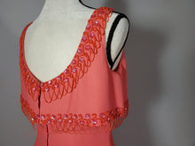 This true vintage 1960's - 1970's feminine flirty wiggle dress with a flapper flair is perfect for your next cocktail party. The front and back of the collar and bodice are embellished with draping peach colored beads and pink floral sequins that were hand jeweled in Hong Kong.