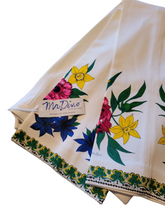 Extraordinary vintage pants with bright silk-screen printed floral motif all around the bottom hems.