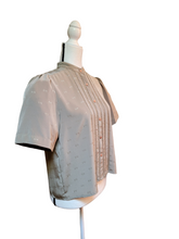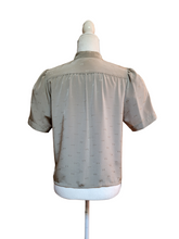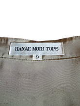 The pre-loved top features a front closure with six monogrammed “HM” buttons, an extra button sewn in on the interior tag, short sleeves gathered at the shoulder, the “HM” logo stitched throughout the fabric, and six front vertical rows of delicate lacing. It’s a jewel.