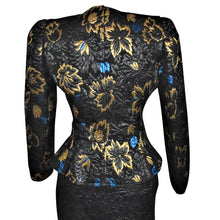 The jacket is beautifully constructed with eight panels of floral metallic brocade fabric with blue, black, and gold metallic threads with a low, front button closure. The skirt is fully lined. Side zipper with clasp and snap closure at the waist.