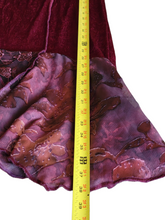 Lovely art to wear stretchy skirt set with various lace, floral, and embroidered trims at the neckline and a shapely skirt with a ruffled, floral hemline.